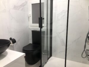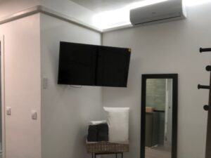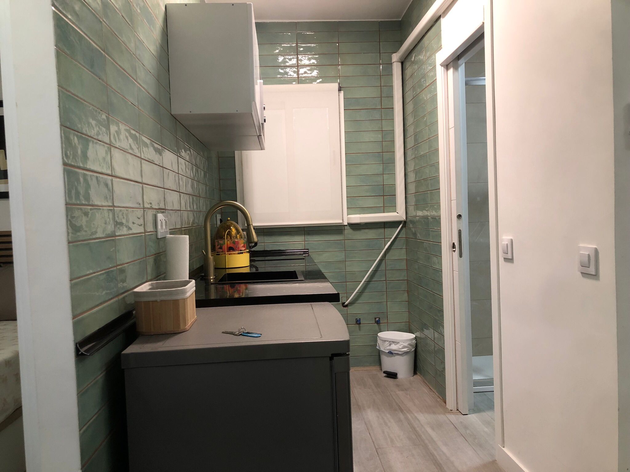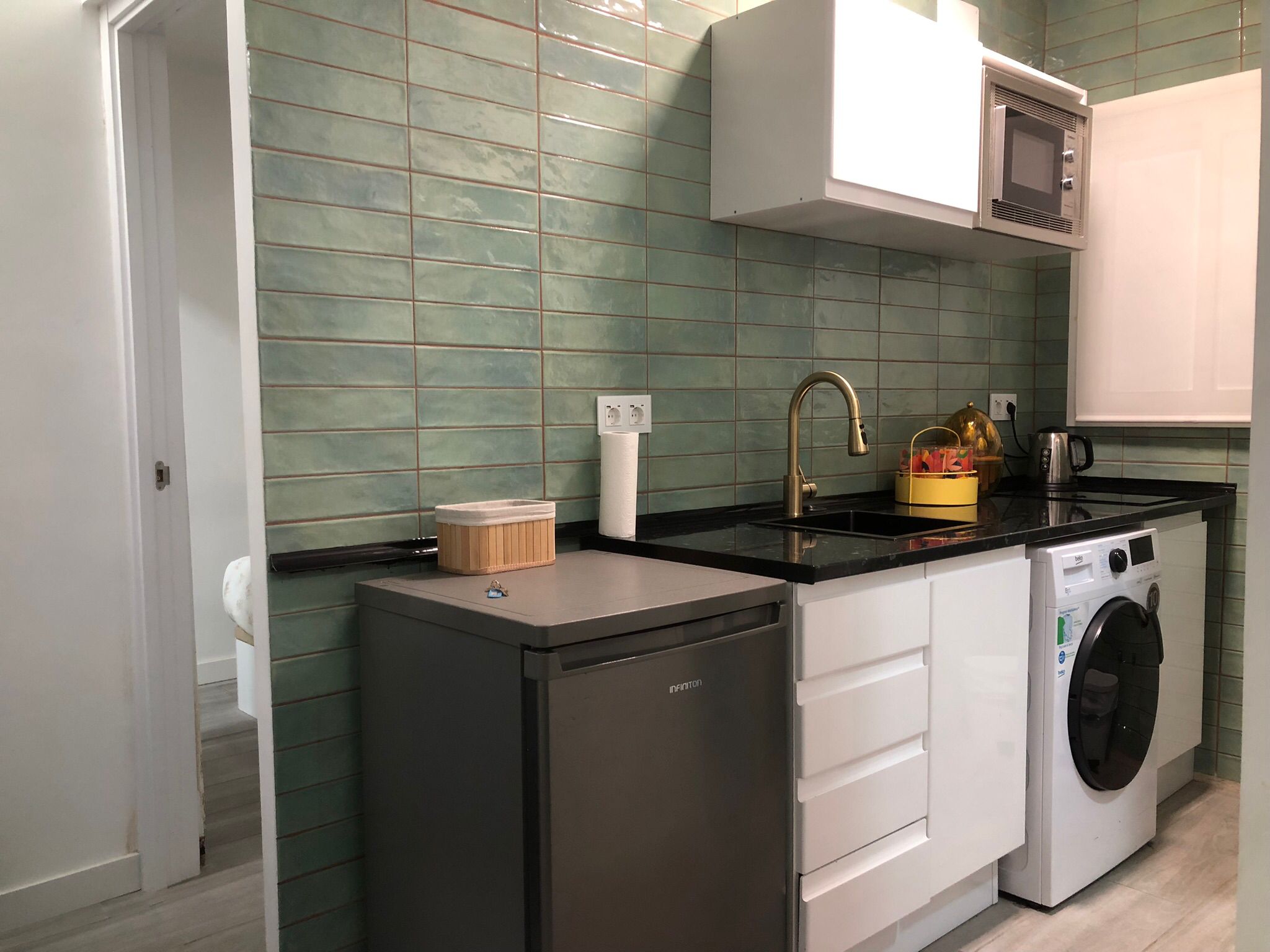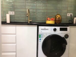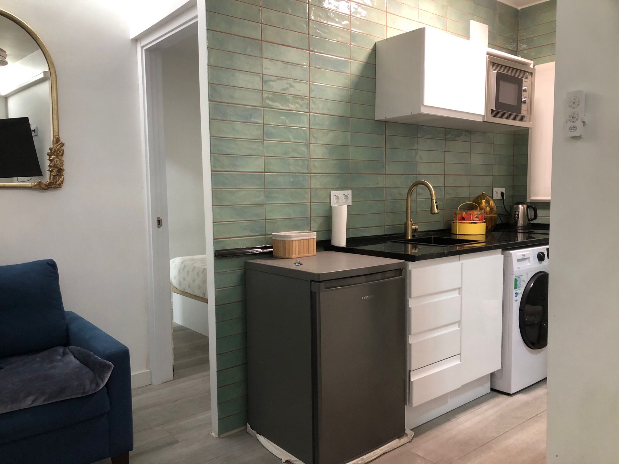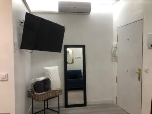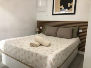 El piso se distribuye en una estancia de estar, que también se puede usar para un huésped más ya que dispone de sofá cama, está unida a la cocina que tiene lavadora, vitrocerámica, tetera, microondas y nevera, todo recién estrenado, junto a ella, hay un moderno cuanto de baño completo con ducha, a la izquierda está el dormitorio principal con cama doble, tiene baño en suite completo también con ducha.